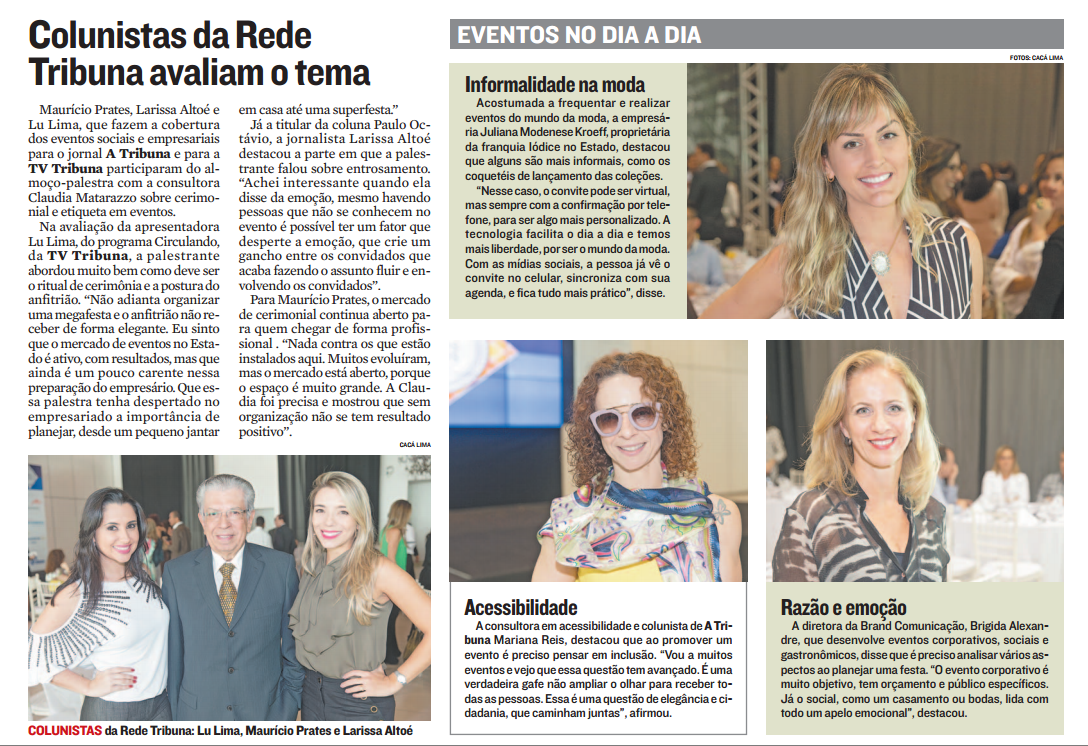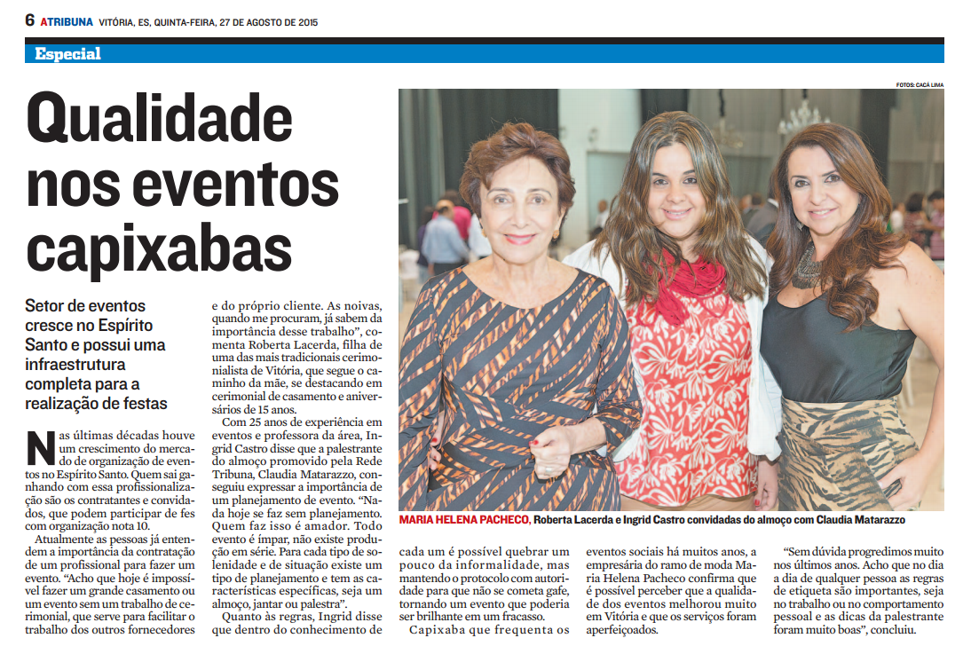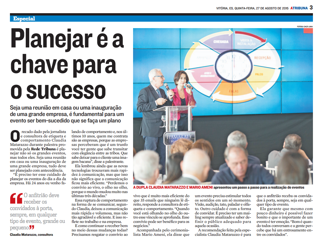Um grupo de mais de 300 empresários prestigiaram a palestra da Claudia Matarazzo em Vitória, como parte do Projeto “Em Pratos Limpos“, que gerou esse caderno especial da Tribuna. Os empresários foram favoráveis nesse tipo de esclarecimento ao setor – pois tudo pode ser feito para se ter um retorno ou ficar péssimo para o contratante. Entenda melhor a matéria.