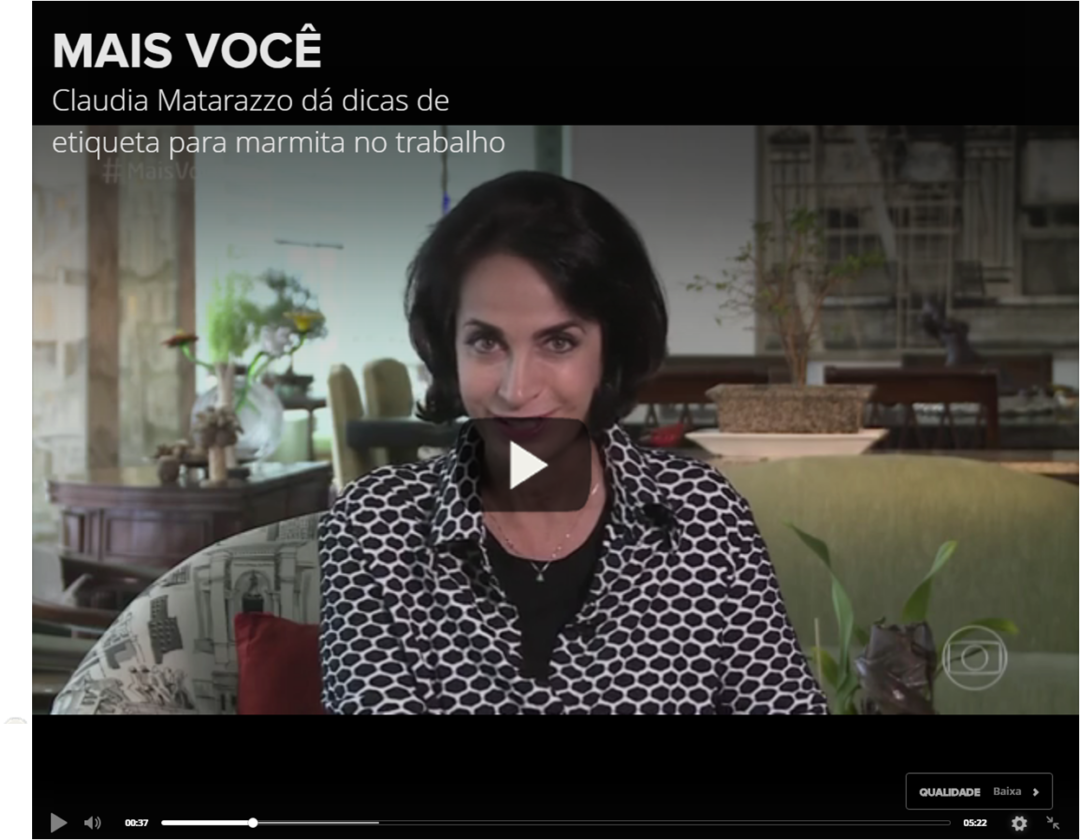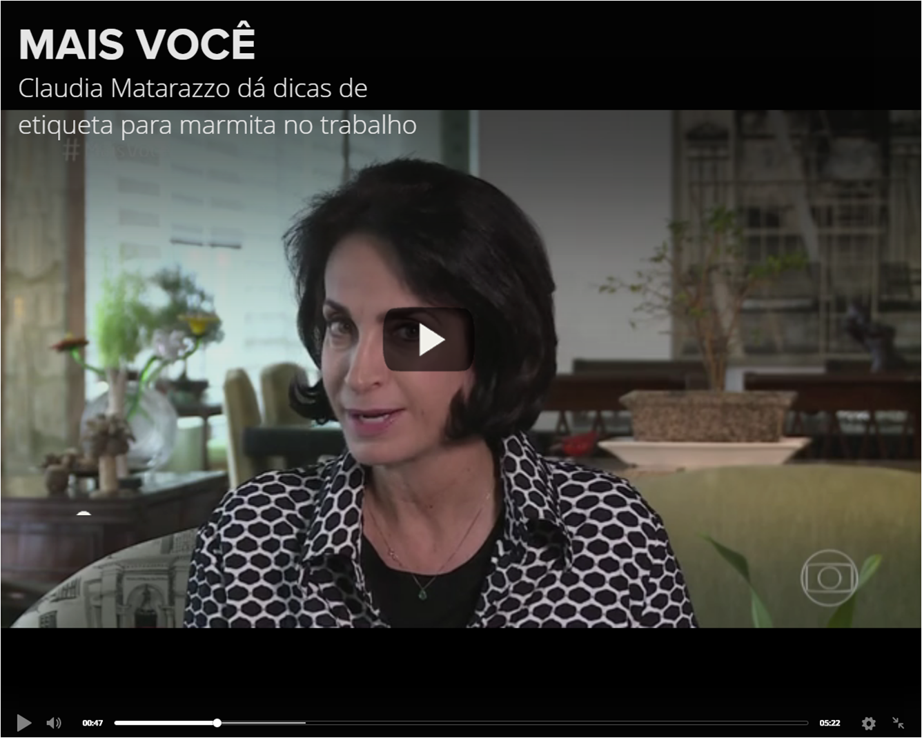 Clipping e Portfólio Etiqueta Empresarial Mais Você – Rede Globo – Como comer no ambiente do trabalho Postado em 19/07/2017 0 Comentários De Claudia Matarazzo Claudia Matarazzo Jornalista e Especialista em etiqueta e comportamento. Viaja por todo o Brasil, ministrando palestras e workshops na área do comportamento. Autora de 18 livros sobre comportamento, moda e inclusão social, ganhou o Premio Abril de Jornalismo. VOCÊ TAMBÉM PODE GOSTAR Claudia Matarazzo em Imperatriz – 07/11/2015 Mesas de Natal – Programa Revista da Cidade – TV Gazeta SP 23/12/2018 7 top gafes a mesa que derrubam qualquer um 20/12/2019 Sem comentários Deixe um comentário Cancelar respostaNome * E-mail * Site Salvar meus dados neste navegador para a próxima vez que eu comentar.