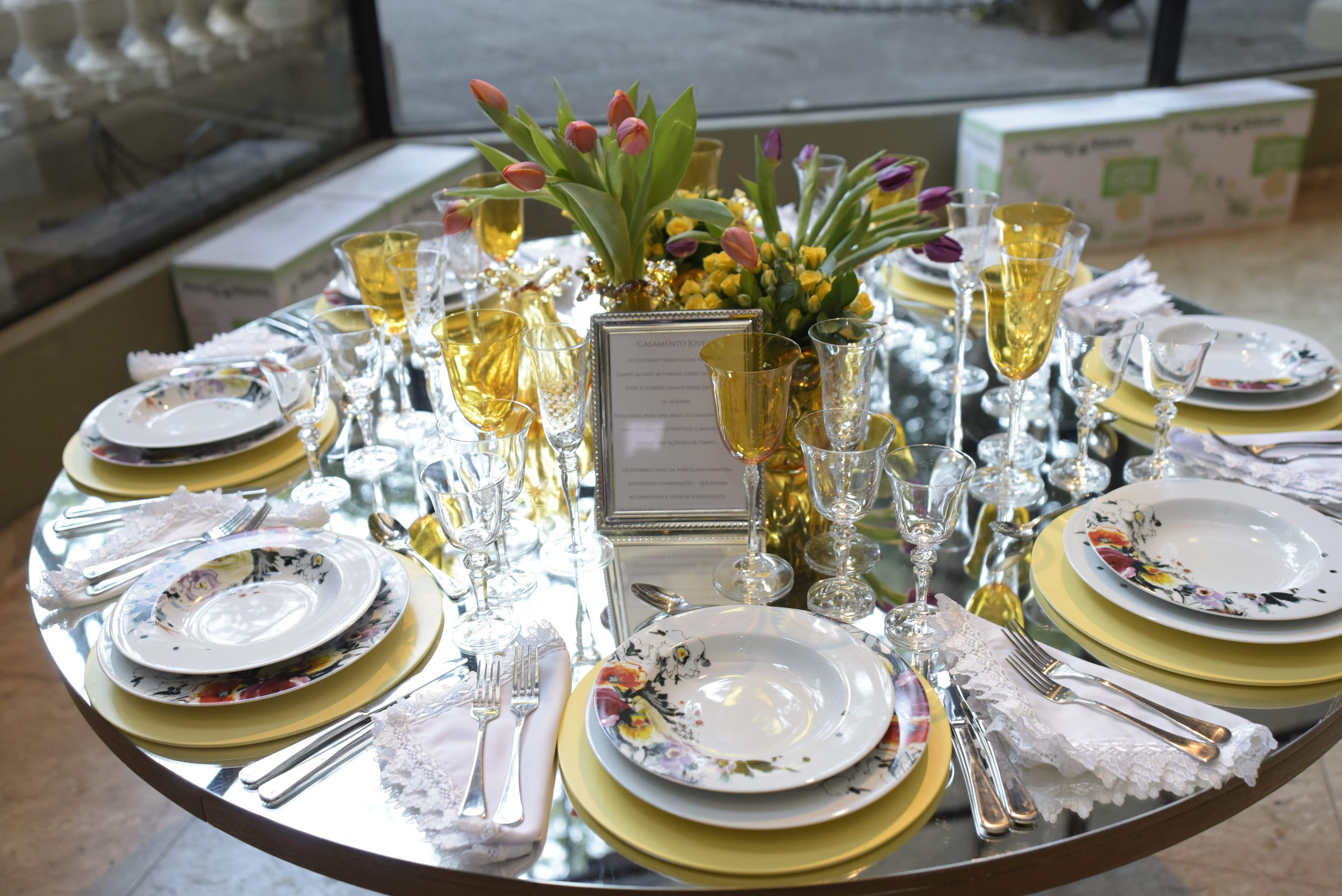 Em uma mesa mais informal, como essa acima, a mistura deu certo! E o amarelo é perfeito, harmonizando com os pratinho de pão no mesmo tom. A porcelana é a minha linha assinada “Aquarela” para a Porcelana Schmidt. Finalmente, já falei isso aqui mas sempre é bom lembrar: as taças são delicadas e muitas vezes não temos o jogo completo de todas. Pois alugue!