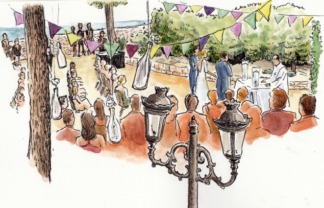 Aí, a partir de algumas informações dos noivos (quem são os convidados mais queridos, família etc ) ele não apenas ilustra a ação do que acontece no dia mas também confere o seu toque de fantasia embelezando para sempre a lembrança…