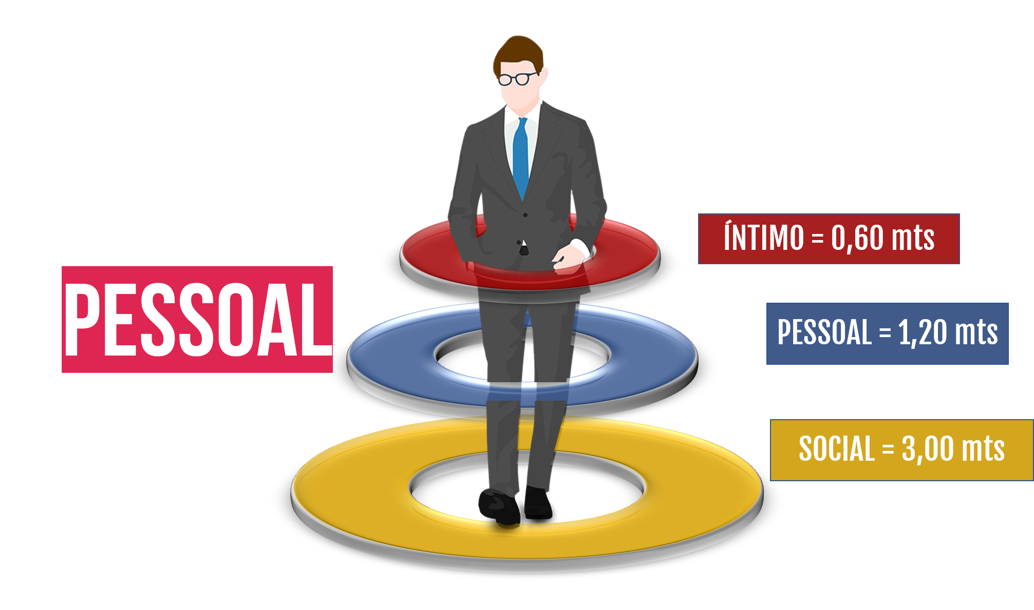 Já, em uma situação pessoal com colegas, conhecidos e gente com quem estamos mantendo uma conversa – seja ela formal ou informal, a distância de 1.20mts é reconhecida no mundo todo como confortável. Essas medidas foram pesquisadas em vários estudos internacionais, pelo cerimonialista Mario Ameni, assim como a ilustração para facilitar .