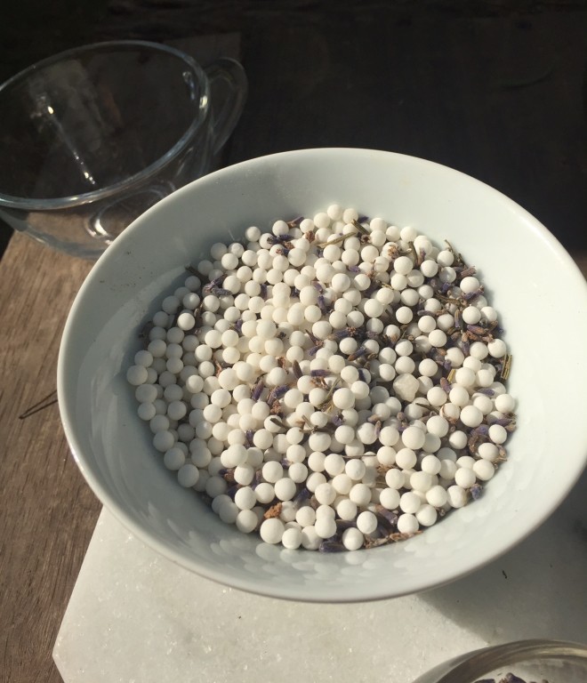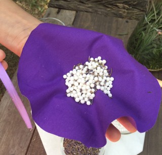 O que precisa: sagú (sim, aquele de cozinha), lavanda seca, retalhos redondos de tecido, fitas finas de cetim e álcool.