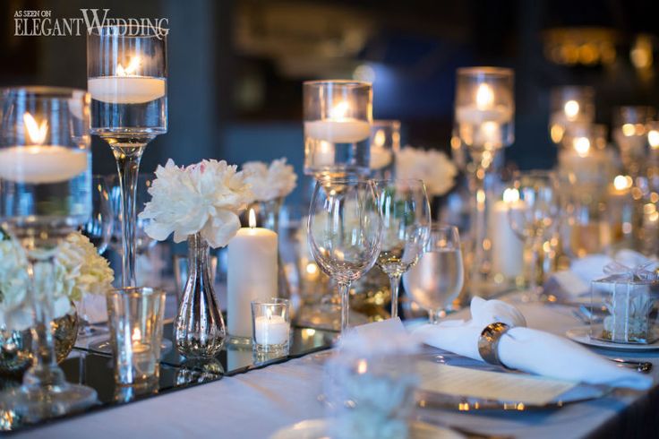 mesa de jantar, com todos os utensilios, em tons de prata, guardanapos brancos, e ao centro vários castiçais em vidro com pequenas velas acesas.