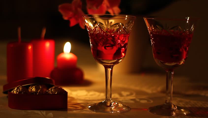 mesa de jantar, com taças de vinhos tinto, ao fundo temos velas vermelhas e uma acesa