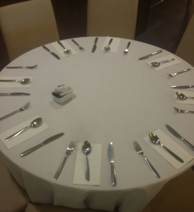 Poderia ser um relógio. Ou uma instalação artística para a bienal. Ou ainda um jogo de paciência daqueles em que substituímos as cartas por objetos. Mas era uma mesa pseudo colocada e pronta para o café da manhã em um hotel 6 estrelas de Natal.