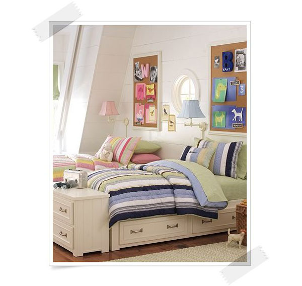 Gosto muito dos quadros de cortiça em cima das camas. O quarto fica mais ainda com a cara das crianças se eles colocarem desenhos e fotos na decoração.
