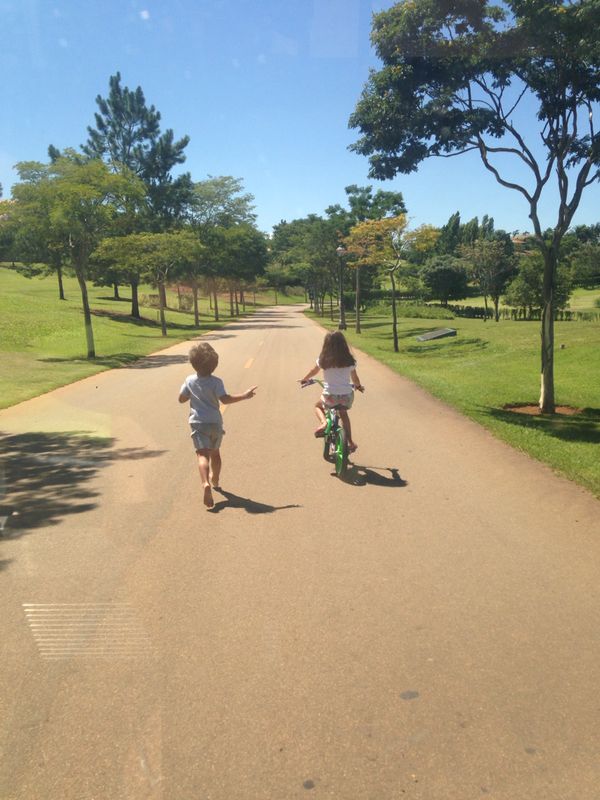 Numa manhã de sol, céu azul, numa rua de um parque, temos uma imagem de costas, de um menino corre junto a uma menina que anda de bicicleta.