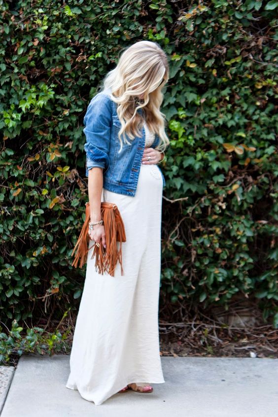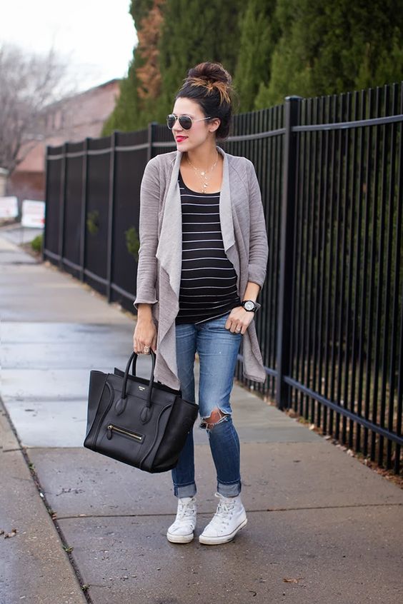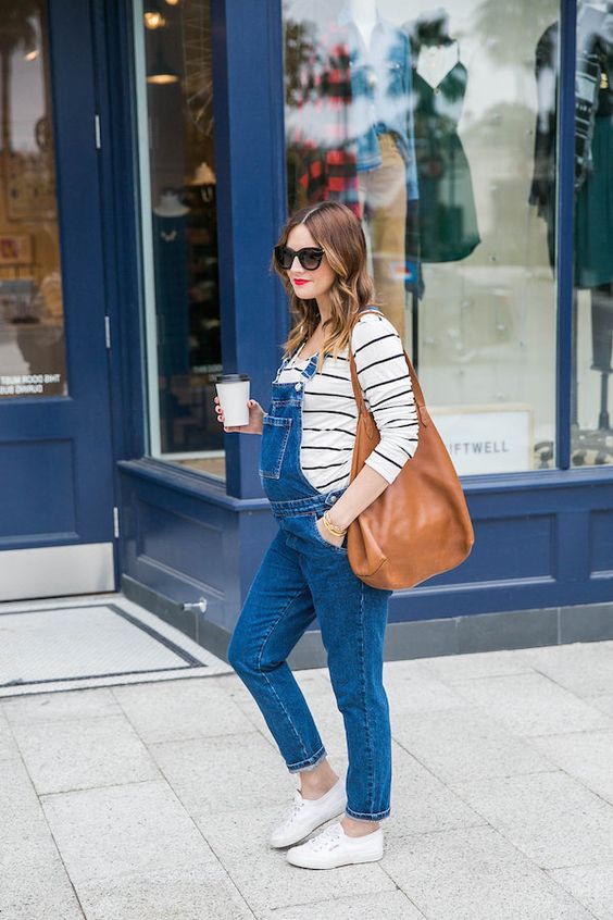 Olha aí o jeans, onipresente, nas futuras mamães. Pode ser em uma jardineira, com um cardigã moderno e até mesmo num estilo mais rock and roll. Se joga!
