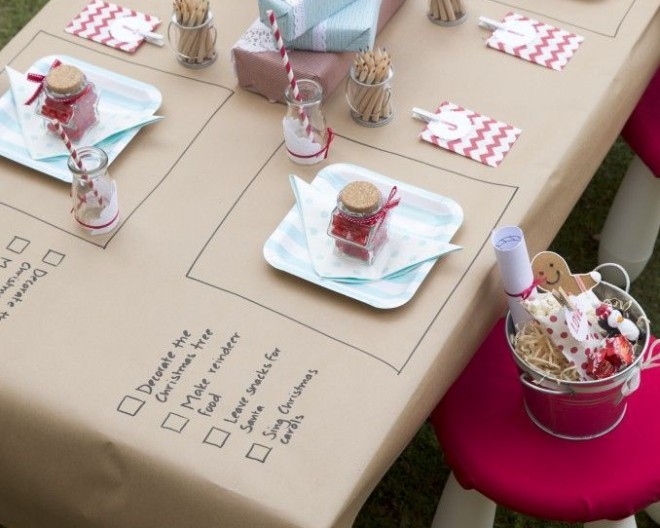 O que achei mais divertido nesta mesa é a toalha: um grande pedaço de papel para as crianças soltarem a imaginação. Na foto, algumas atividades para serem feitas durante a Noite de Natal: alguns enfeitinhos (ja separados para as crianças) para colocar na árvore, deixar alguns biscoitos para o Papai Noel, enfim, escolha as funções que mais agradarão seus pequenos.