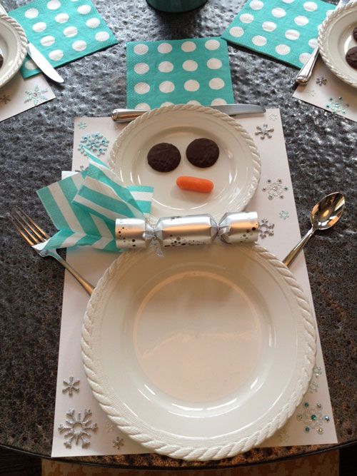 Que tal usar os pratos e talheres para fazer um boneco de neve? Dois biscoitos para os olhos e uma cenoura como nariz