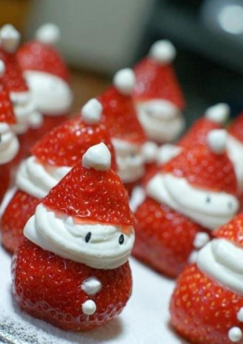 Pode ser mais fofo esse Papai Noel feito com morangos e chantilly? Escolha os morangos maiores para ficar mais fácil de partir.