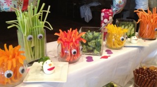 Muito criativa a idéia de fazer carinhas nos potes de legumes. Cenoura e pepino se transformam em cabelo dos monstrinhos.