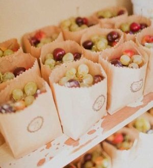 Saquinho de papel pardo com frutas da estação. Lembre de deixar tudo lavado e bem sequinho para não estragar o papel.