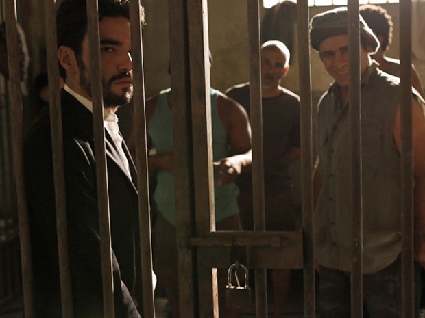 O ator Caio Blat, no personagem José Pedro, na novela "Império", da Rede Globo, na cena em que ele está preso, junto a outros 4 outros presos, ele olha para fora da cela e usa terno sem gravata e os demais usam camisetas. Em primeiro plano as grades da cela , com um cadeado fechado.