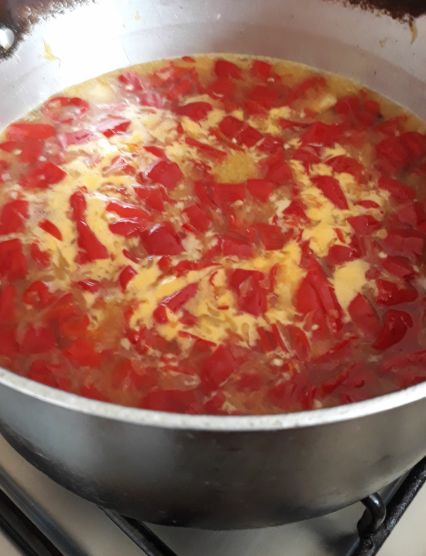 Tire o caroço das pimentas e coloque em fogo baixo com o caldo das laranjas e com os demais ingredientes.