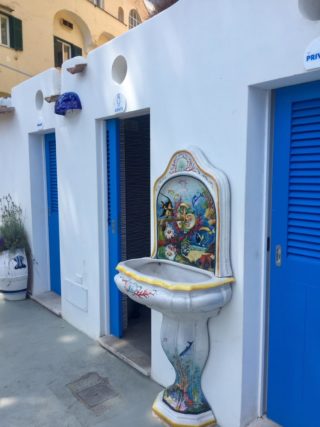 A natureza é estupidamente linda – embora diferente da nossa exuberância tropical. Porém, em Positano, praia turística e popular, onde há dezenas de restaurantes simples e pé na areia, todos se maravilhavam com detalhes prosaicos – tais como floreiras e pias de vestiários.