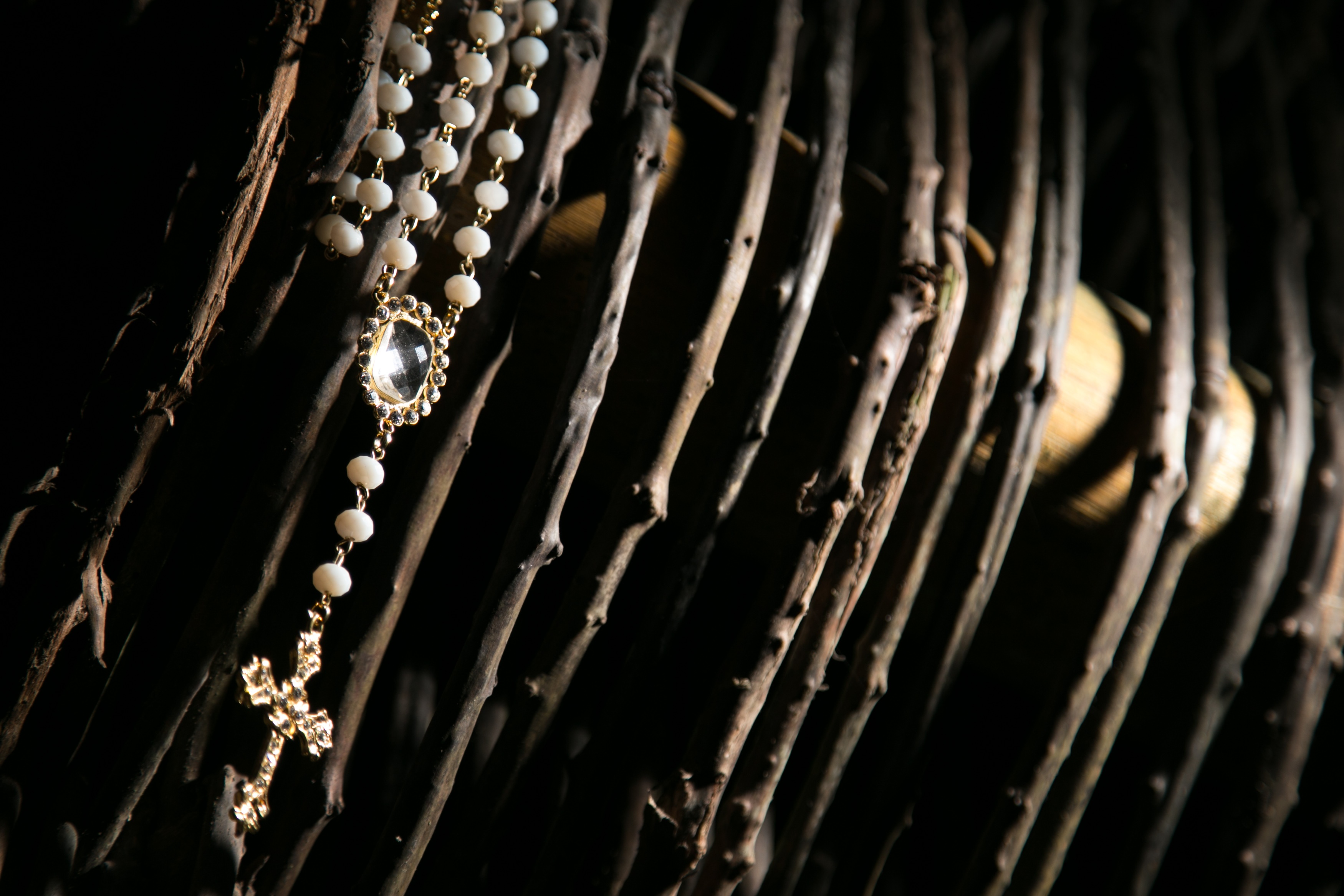 Sobre um fundo de galhos secos marrons está pendurado um terço com contas de pérolas brancas e pequenas com uma pedra sobre o crucifixo em outro delicadamente trabalhado. O material delicado do terço contrasta com o fundo escuro e rústico dos galhos secos.