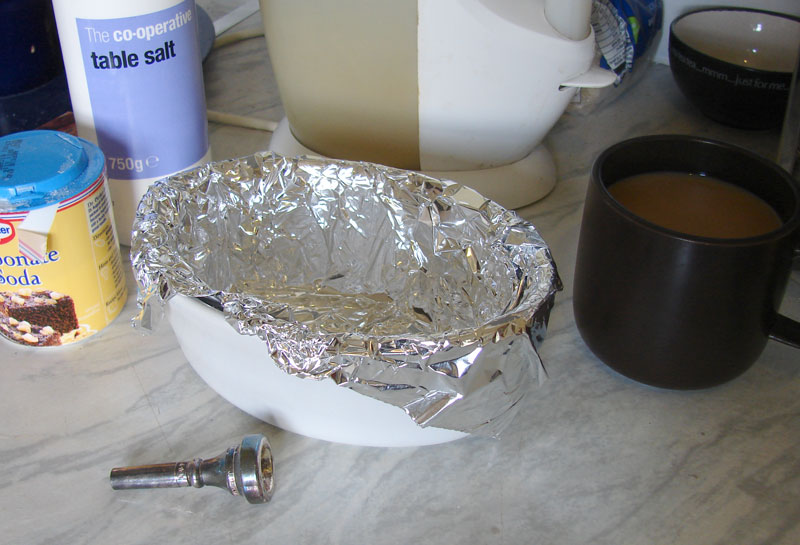 Leve a água a ferver (o suficiente para submergir completamente a prata) e forre o recipiente com um pedaço de papel alumínio, com o lado brilhante para cima. Encha o recipiente com água fervente e adicione bicarbonato de sódio, aproximadamente 2 colheres de sopa por litro de água fervente. Em seguida, adicione a prata, certificando-se de que toca a folha de alumínio.