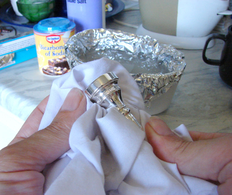 Delicadezae paciência – após alguns minutos, remova a prata (com cuidado – estará quente) e remova qualquer mancha persistente, secando com um pano macio. Se sua peça estiver manchada, talvez seja necessário repetir o processo algumas vezes.