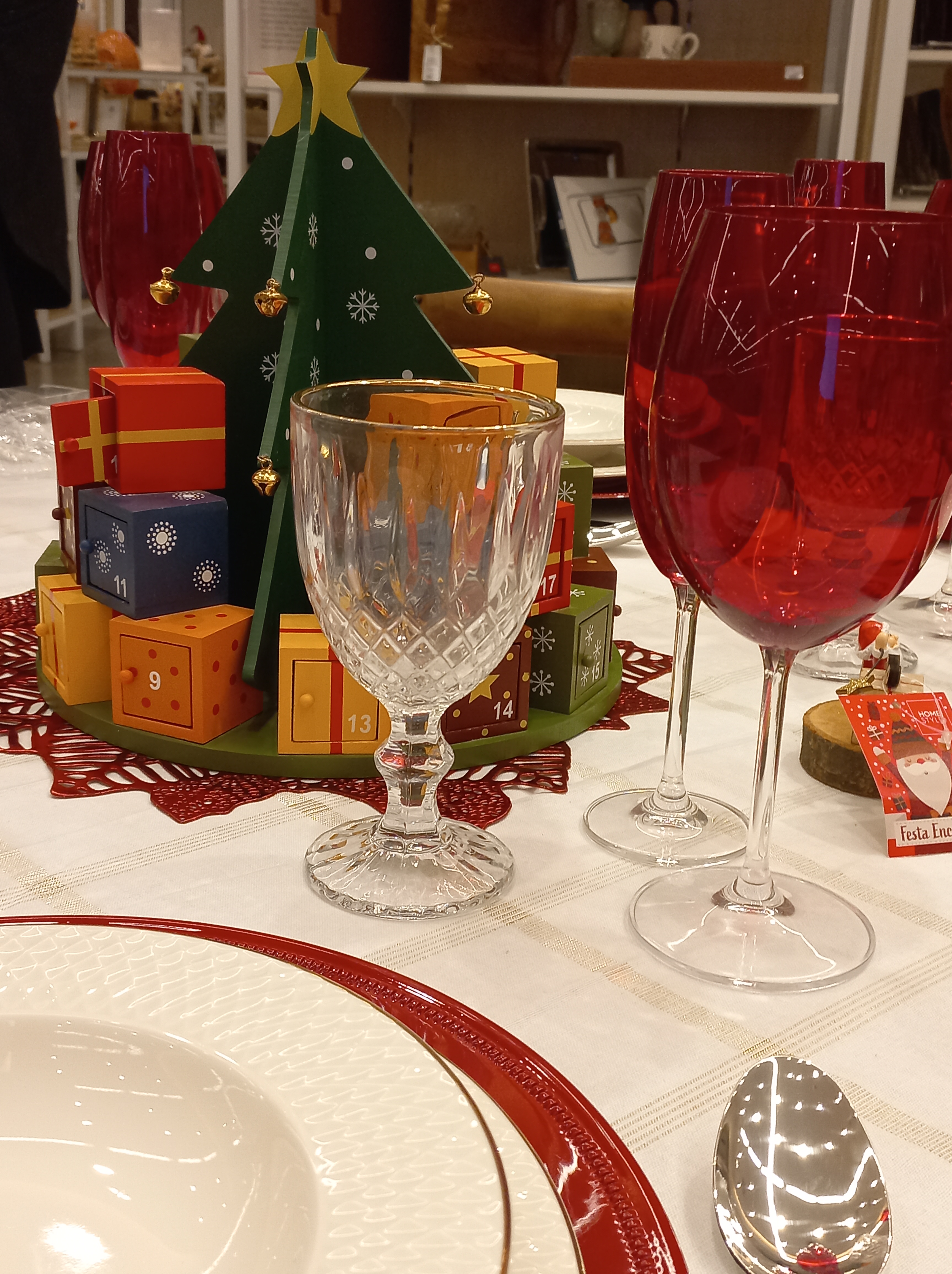 Se vai montar todos os lugares à mesa, o centro de mesa tem que ser baixinho. Pode colocar mini vasos de estrelinhas ou outros vasinhos menores, todos no centro,