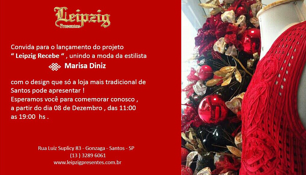 Agora, em Santos sua cidade Natal, Marisa expões algumas dessas peças no evento “Leipzig Recebe “. Apaixonada por Crafts nesta coleção ela faz uso de tecidos marmorizados a mão e intrecciato em algodão como o vestido do convite .