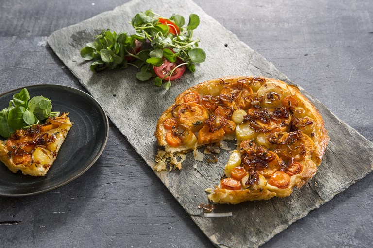 Com a ajuda de um garfo, force as bordas da massa para baixo (lembre-se de que a torta será virada depois de assada). Leve a torta em forno pré-aquecido (180 graus) e deixe assar por 50 minutos ou até que a massa fique dourada.