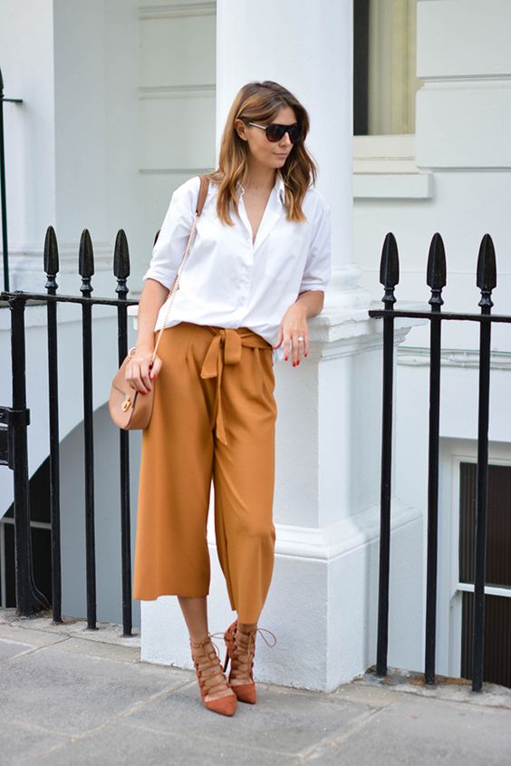 Com Calça de alfaiataria – ideal para trabalhar. Combina com qualquer bolsa e pode ser complementada desde comportadas pérolas até lenços e echarpes coloridas. E dá para continuar impecável no happy hour e até jantar noite.
